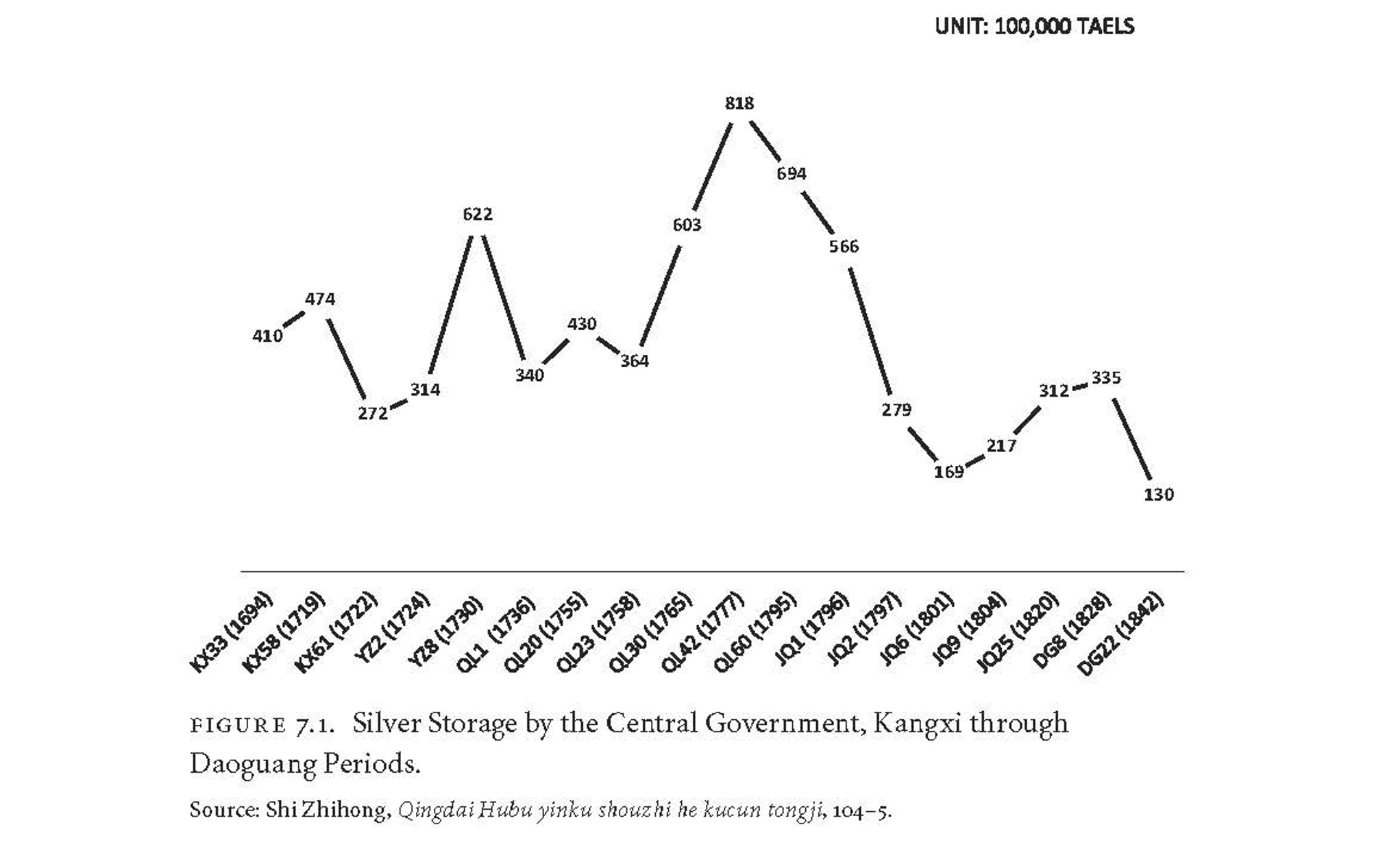 Here is a nice graph from Dai Yingcong (pg. 375) showing the decline of Qing silver reserves.