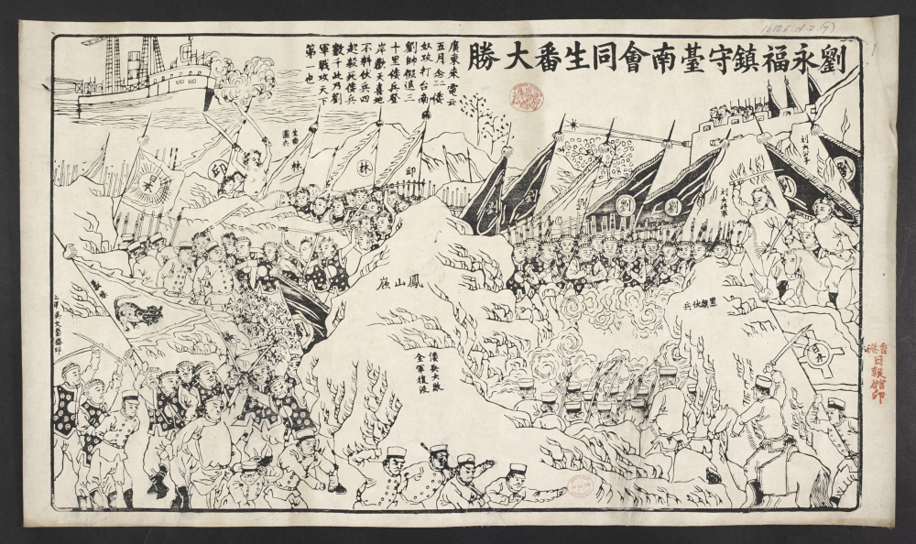 These are apparently both in the collection of the British Museum, but without any attribution. The first has a red stamp in the lower right that suggests it may have been from the Hong Kong Ribao. Both claim to have been done by someone called Wu Wenyi, but I can’t find anything on him. The second one is particularly interesting, since Liu Yongfu (who led the Black Flags in the Sino-French war) is in it. He was actually there, and it makes a nice way to bring in the role of the Black Flags/Triads/Gowned Brothers in Chinese nationalism. There are also some aborigines. I don’t think there actually was any non-Han involvement in this, which makes me think the pictures might be later. (They certainly -look- at bit later) It would be interesting if they were already being that multi-ethnic in 1895. You could do a lot more with them in class with better attributions for the last two.