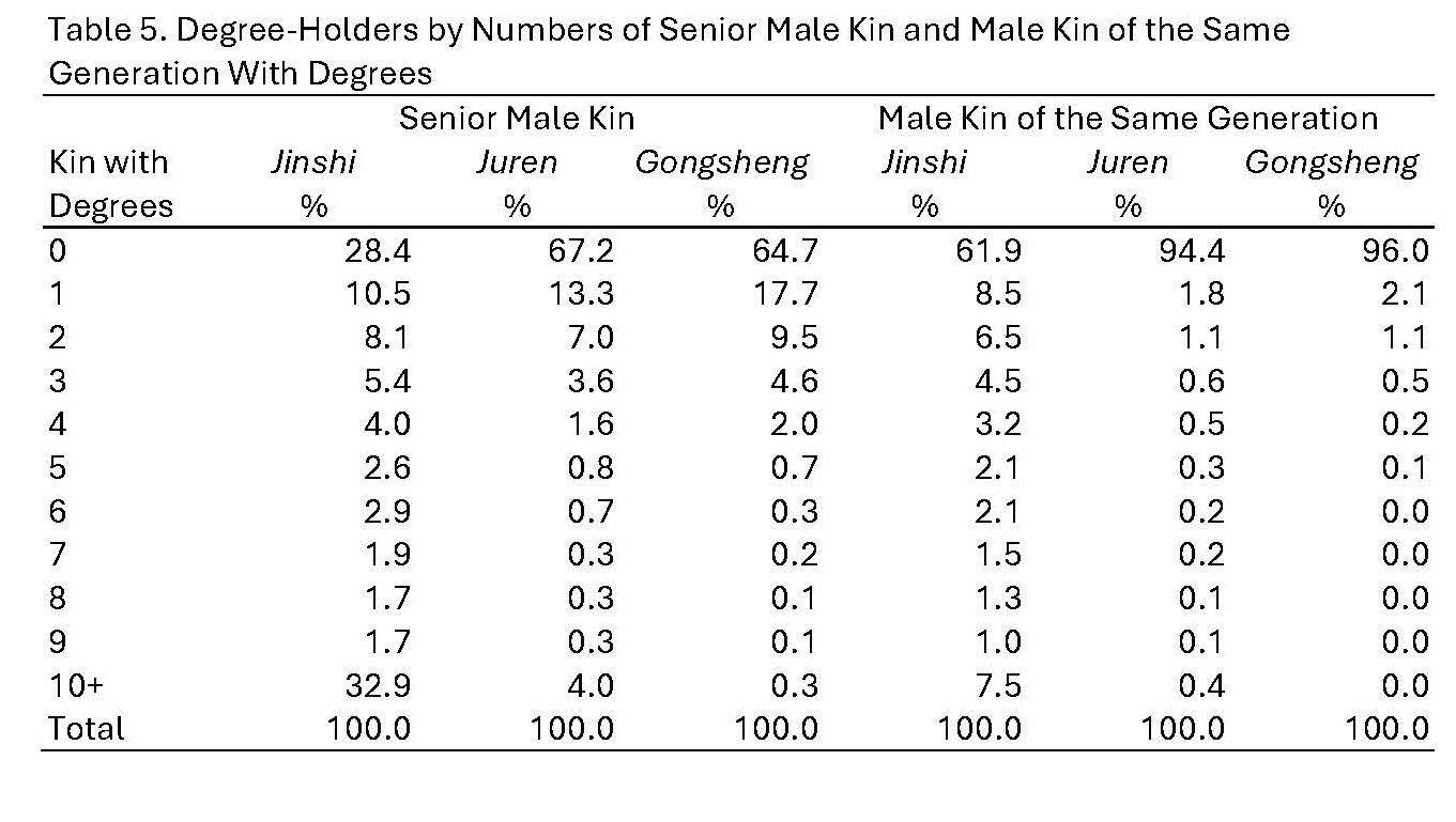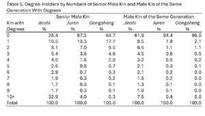 As you can see, the Jinshi (which was the degree you really needed to get a job and have a career at this point) group reported only 28.4 % without any kin with degrees2 This is less than the 32.9% who had 10 or more relatives with degrees.(It is not clear to me if they count relatives who had purchased a degree, although given that the data is self-reported I would guess that they are all treated the same. )