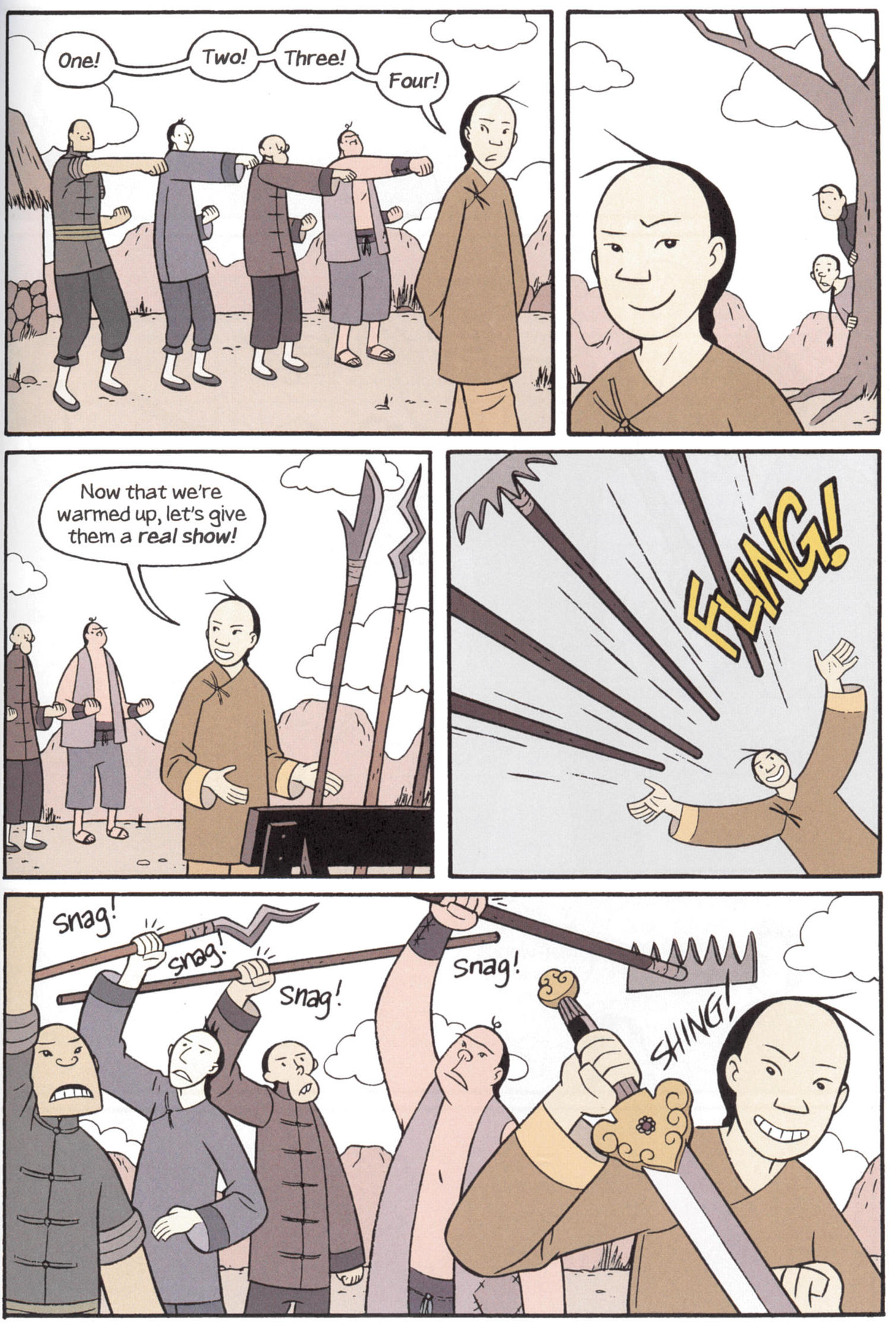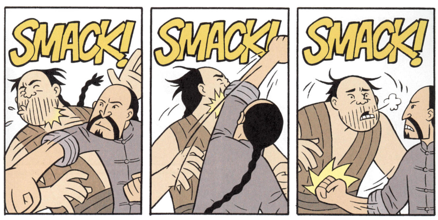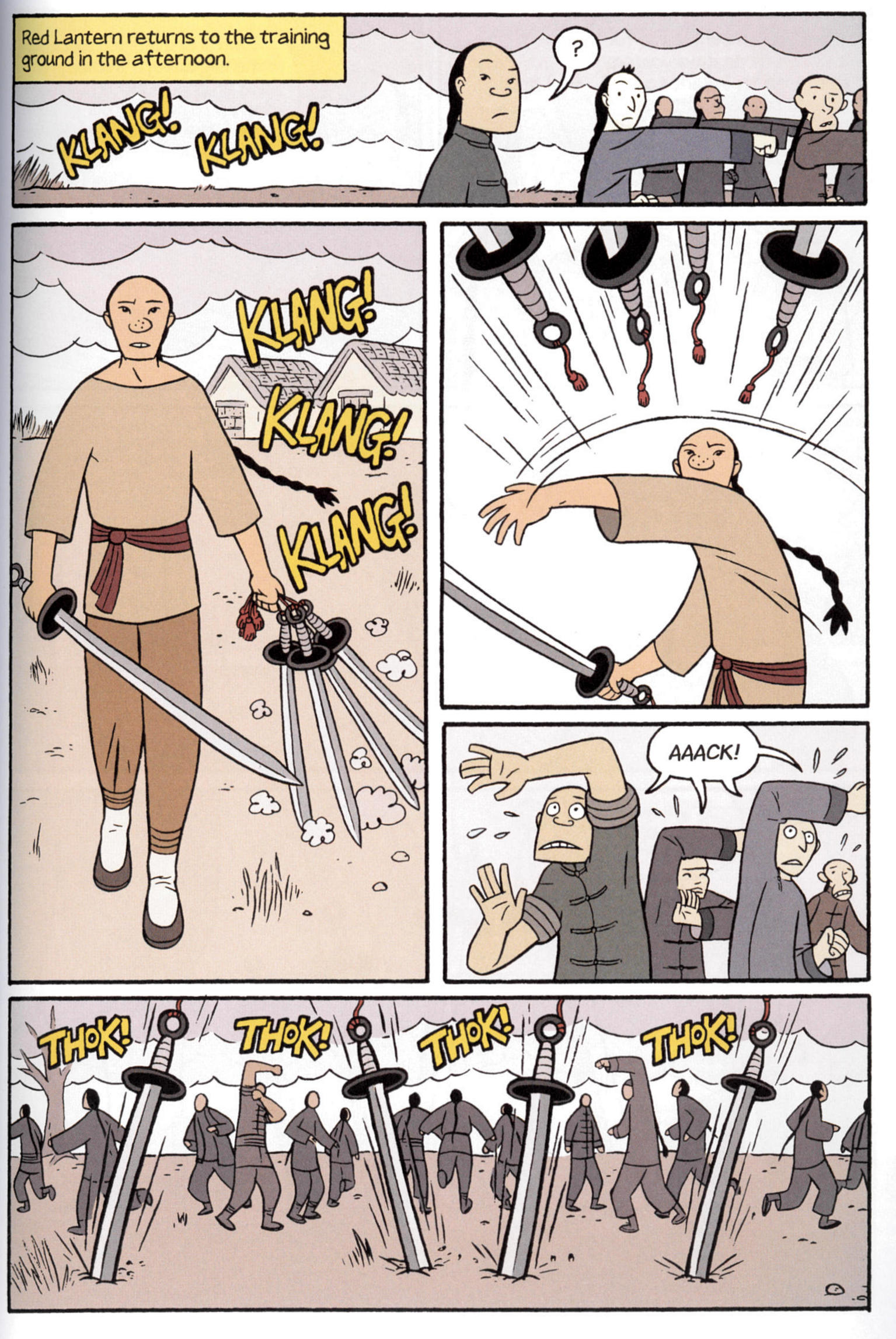 Who apparently studied under Adam West. Yang has a fairly limited style which does not lend itself to the martial arts, especially given what a lot of other people have done with them in Manga. Yang actually seems more influenced by American animation traditions.1 He has two scenes where a gongfu master announces the beginning of the lesson by tossing weapons at the students,