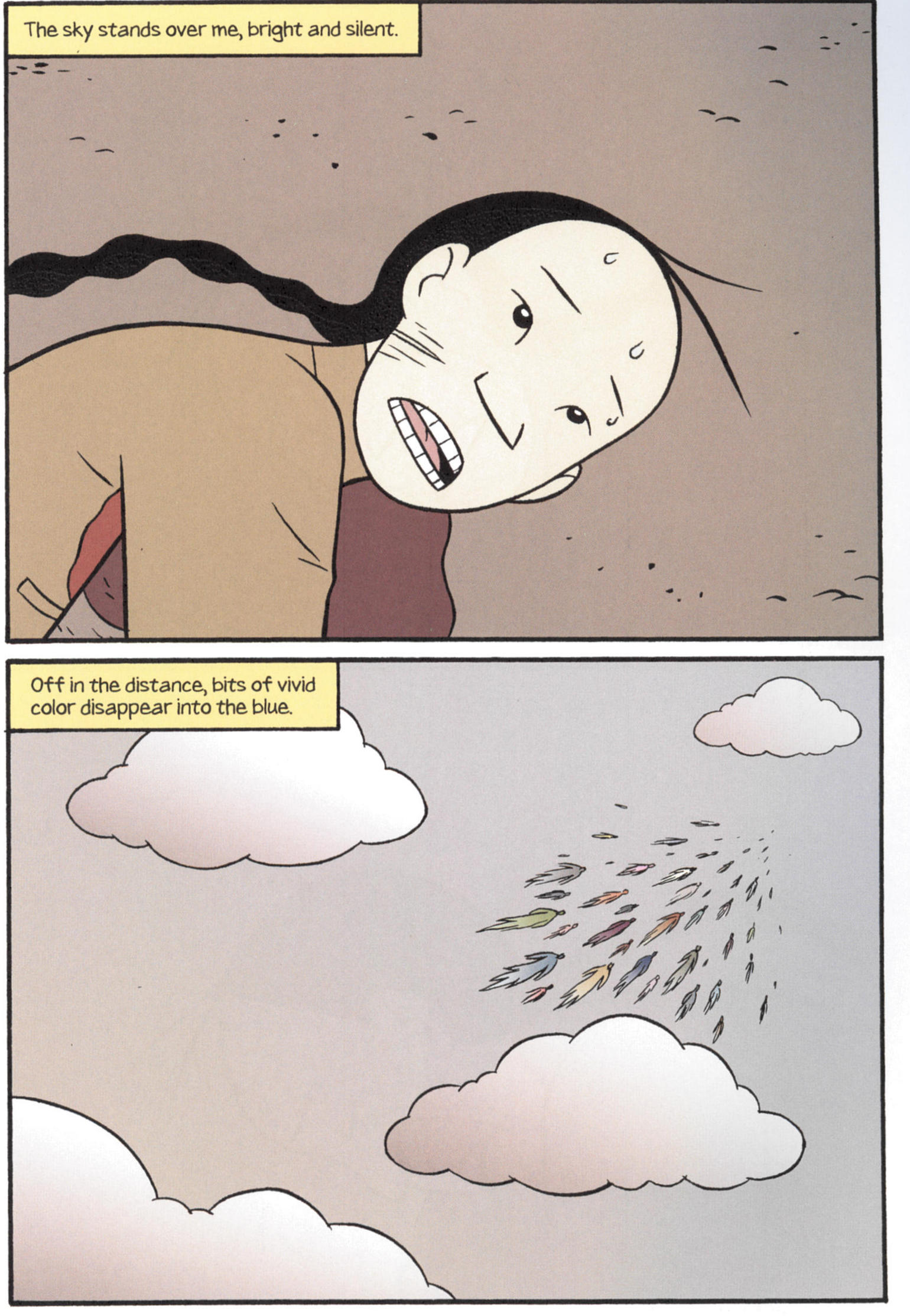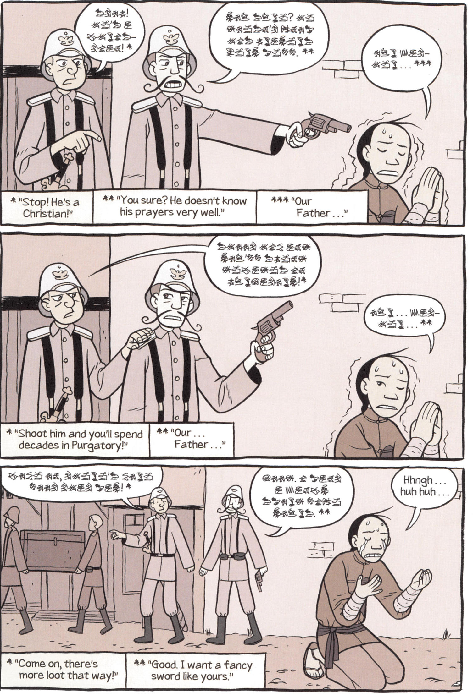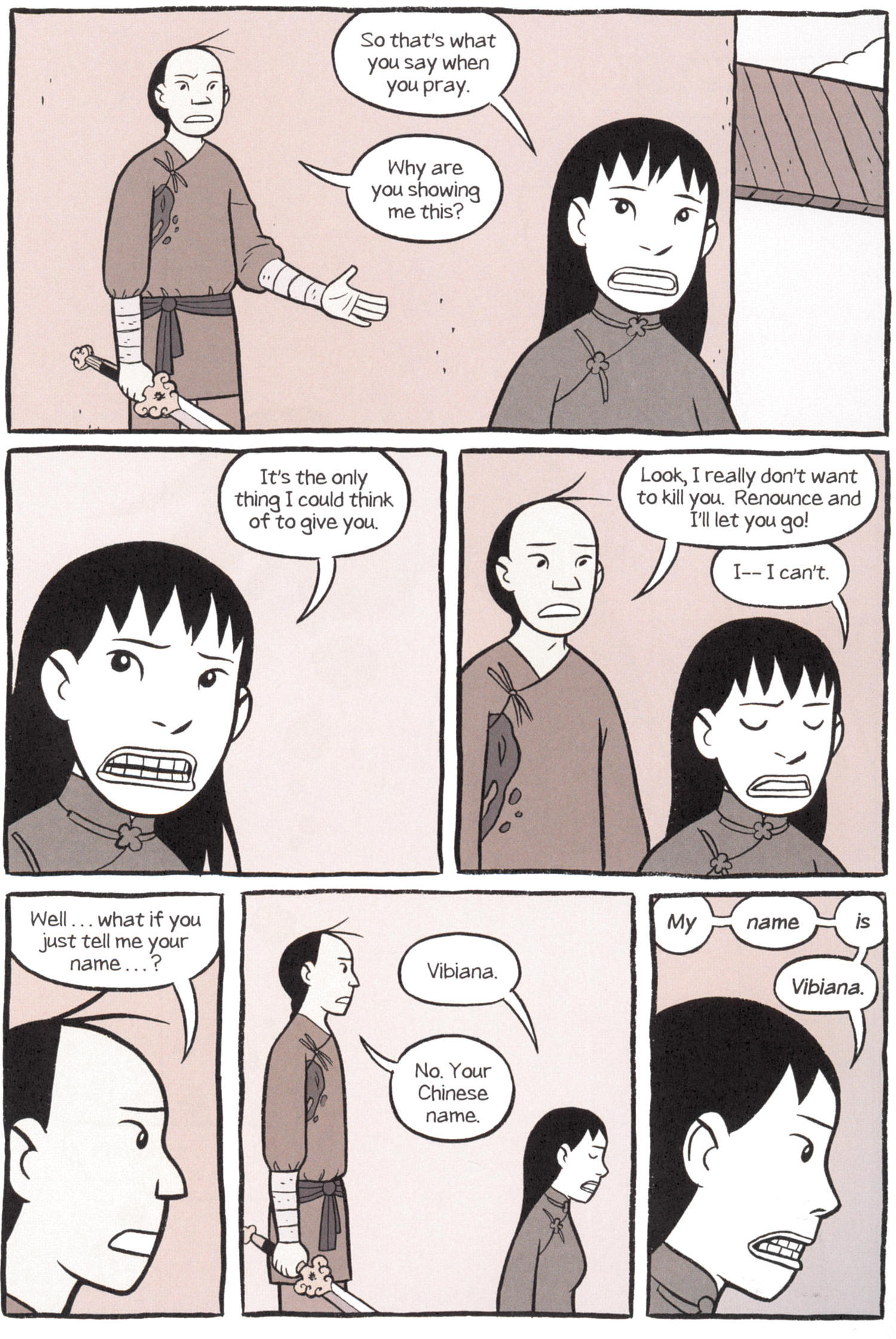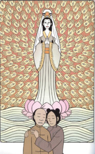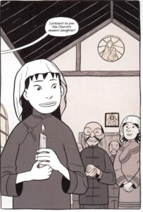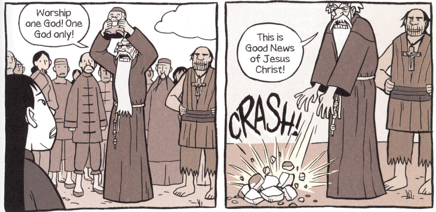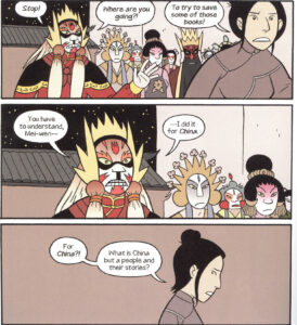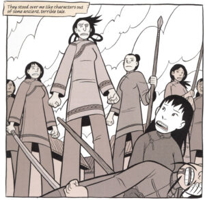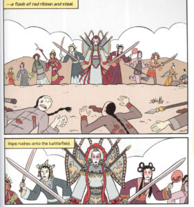 One of the major themes of Boxers is the growing relationship between Bao and Mei and how Bao’s commitment to violence splits him off from Mei’s commitment to culture. Yang does not to make the story too bloody, perhaps in part because his style is not really up to it.