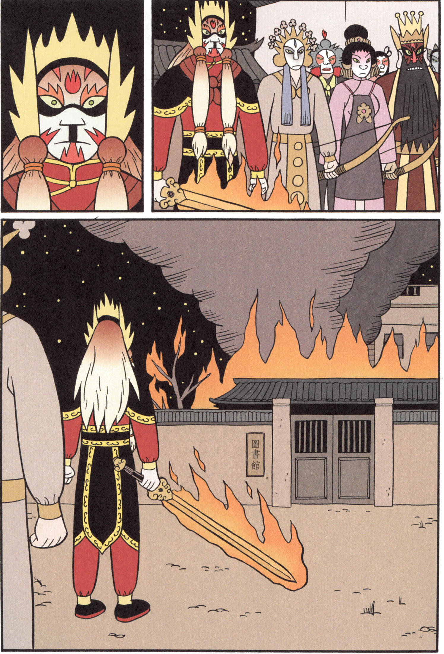 So where did these poor teenagers look for power? Like modern-day geeks, they turned to pop culture. They went to fairs and watched traveling acting troupes perform Chinese opera. Chinese opera told epic tales of colorfully-costumed heroes who fought evil with superpowers and magical weapons. The heroes of the Chinese opera were not unlike the heroes of modern American comic books, only instead of capes, flags flapped at their backs.