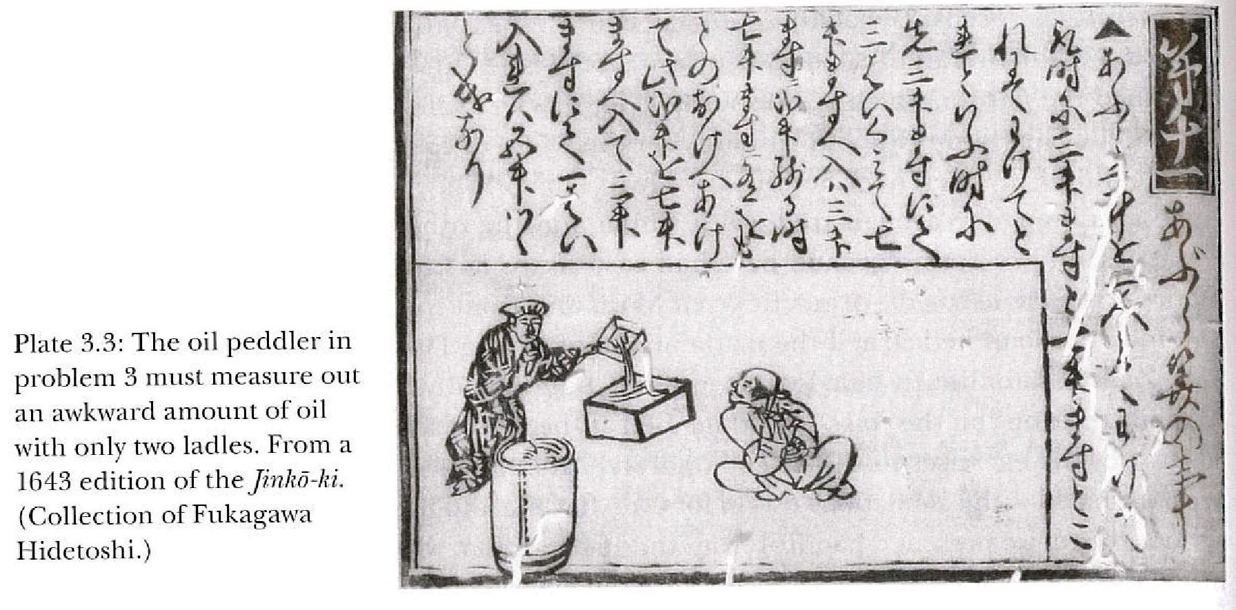 Why does math help? Well, here is an oil merchant who has measure out some oil using two ladles of the wrong sizes. I bet math would help him!