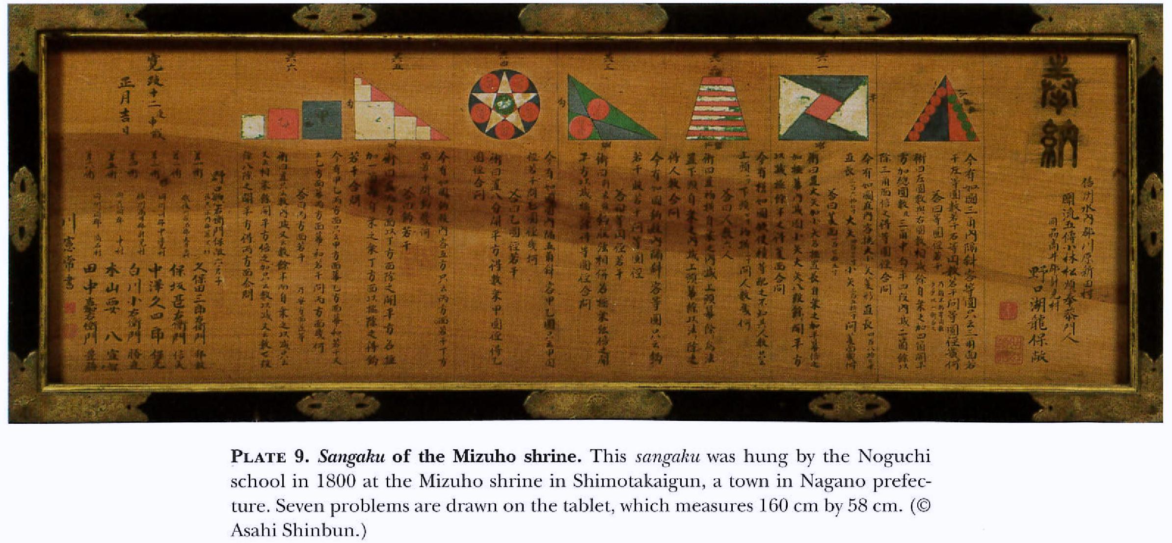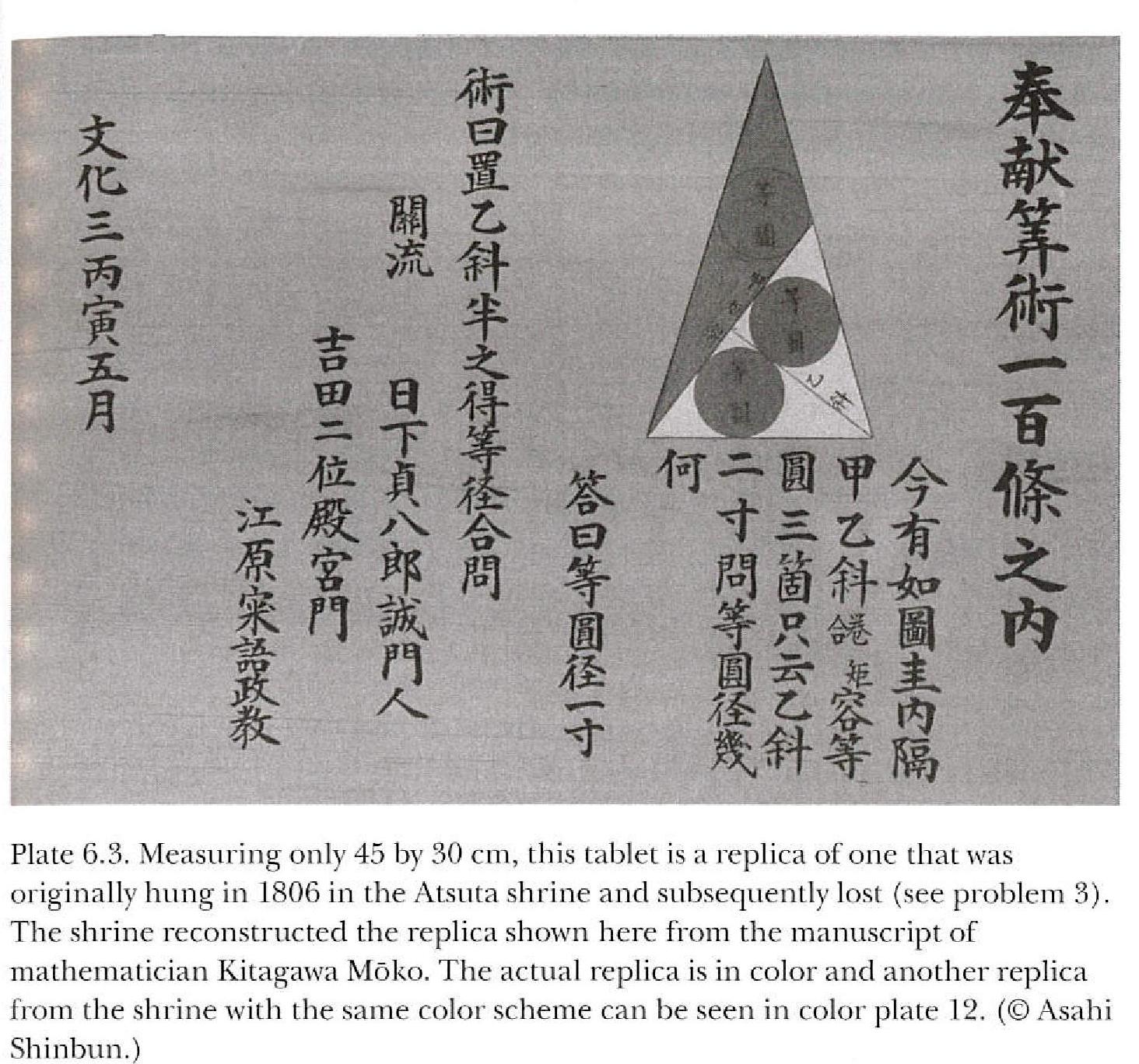 I would have liked more social history on these math groups. Was there some religious significance to them? I assume that to some extent math groups served as social networks, like poetry groups, but I would like more on that. They mention that women sometimes solved these, but little else on the make-up of the groups. This being Tokugawa Japan I bet there are several 12-volume studies of these math groups, but nothing I could quickly google led me to an explanation of the social background. There is at least some info here Noel J. Pinnington. (2009). Sacred Mathematics: Japanese Temple Geometry (review). Monumenta Nipponica, 64(1), 174-177.