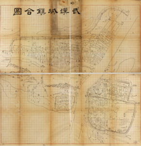 This map is one of the British War Office maps that can be found for many Chinese cities. A full 160MB tiff version is available for download from Princeton. This one looks like it is on the basis of surveying, with its regular grid, and latitudes and longitudes in the corner points. Other Chinese cities in this series I’ve seen, such as the map for Yantai from a few years earlier, are reproductions of late Chinese imperial or early republican period maps.