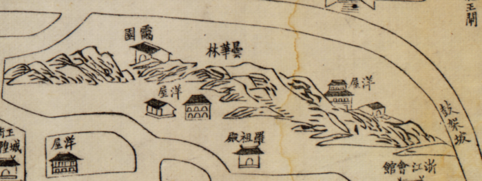 This map of Wuchang, as capital of Hubei province, is dated 1885. By this point, the Hankow Medical Mission Hospital has been founded, the Wuchang Wesleyan mission has opened in southern Wuchang, the London Missionary hospital has been established, the Hankow Golf Club has been founded, the Russians have established a brick-tea factory, and there is a large enough concentration of foreign missionaries that Wuhan becomes one of the central publishing centers for Christian tracts in China with its Central China Tract Society. Now, here and there, scattered among the other buildings you can detect the presence of the foreigner in Wuchang as well, not merely in the foreign concessions across the river in Hankou. Note the buildings with the 洋屋 (Foreign houses) labels. Throughout these older maps, they tend to be distinguished by their many windows, while other buildings are usually are marked by their entrances, columns, and the stylobate platforms at the base.