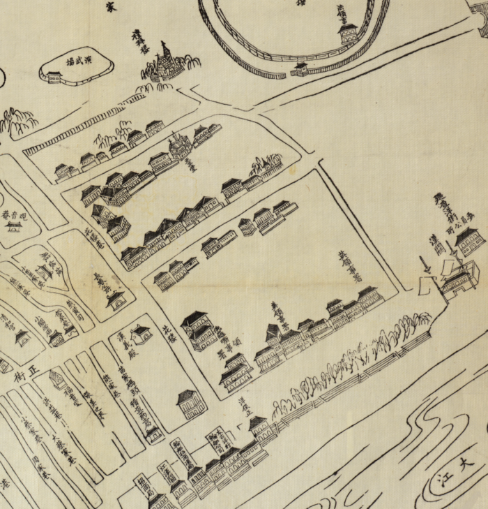 Above you can see some of the depiction of Wuhan’s hills in Hanyang and Wuchang. Besides the relatively empty streets and racecourse of Hankou’s British concession, there is very little in terms of evidence of the foreign presence. Zooming in closely will show the French and British consulates, and the Customs office. This will soon change as we move just a few years ahead in time for the next two maps of Hankou and Wuchang.