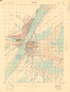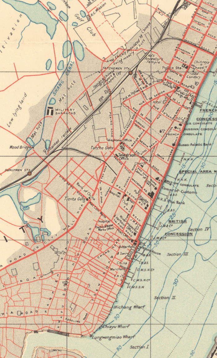 On this map we now see the railway lines (Beijing to Hankou, and the incomplete Guanghzou to Hankou on the eastern side, eventually connected by bridge in 1957), all of the concessions (the “special areas” are the former Russian and German concessions returned to Chinese control, and the British concession will formally become one of these special areas the very same year this map is dated). Notice that, except for some of the more important buildings in Wuchang, the British cartographers have very little interest in locations relevant for Chinese residents in the city. Not too the “Mat huts” and “Area thickly populated by Chinese living mostly in huts” just to the south of the Hankow Golf Club. This map will be reprinted and modified several times in the years to come, sometimes with minor changes or additions in the labels and can be found with later dates in various archives (See this one here for example).