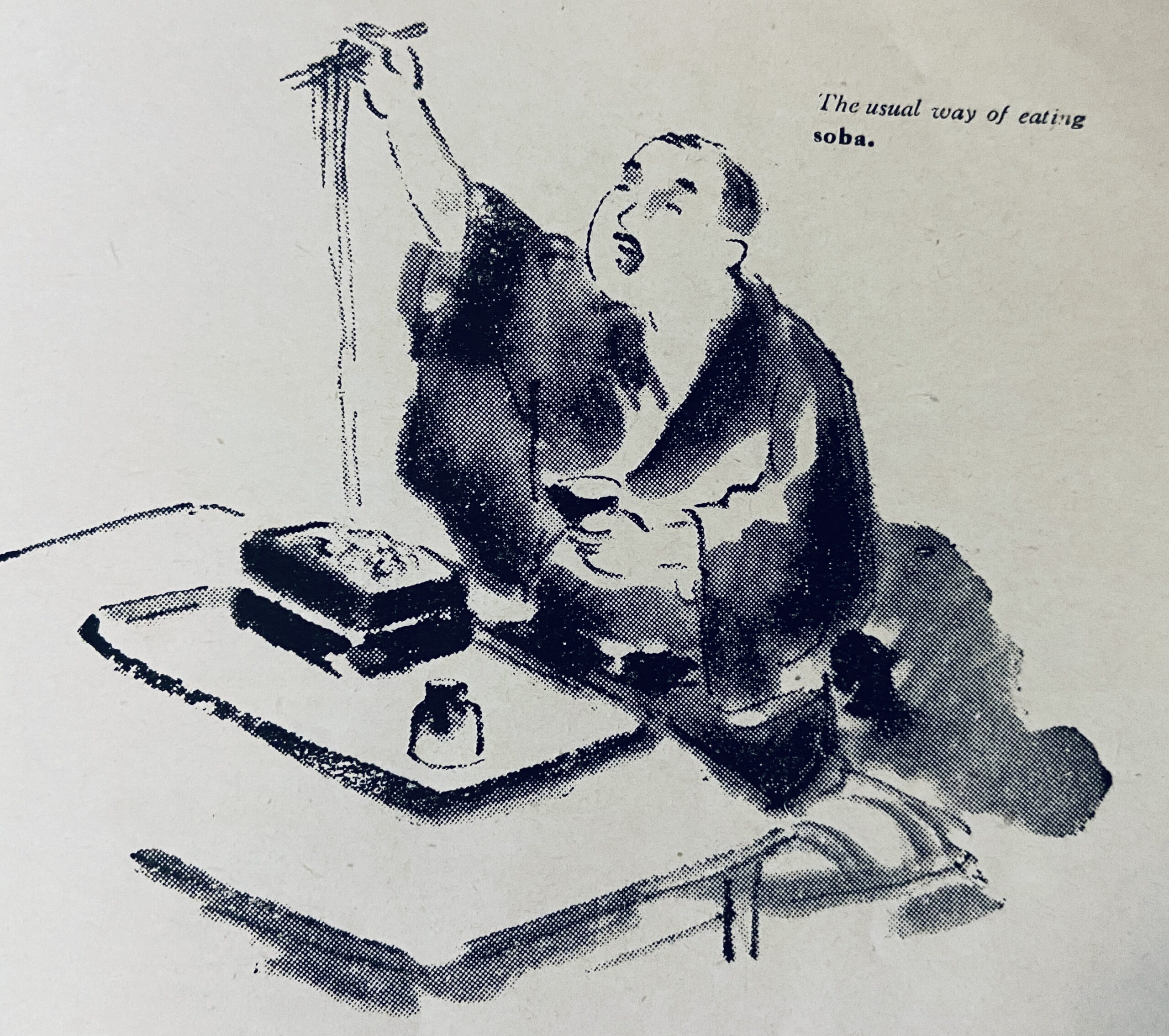 The most passionate language in the pamphlet is found in the section on soba or “Buckwheat macaroni”, Japan’s “food for the people.”6 The crop of buckwheat itself is described as having “a queer destiny of receding before the advance of civilization,” shifting over time and “follow[ing the] Ainu in its northward retreat from developing culture” and ending up in the “backward provinces” on the “shady side of Hokkaido”7 This “retreat” north of buckwheat is given an unusual amount of space and at once replicates a standard narrative of combined civilizational progress and northern conquest, but then pivots to celebrate its use: praising its more “primitive” milling methods and its rich nutritional content, or highlighting its deep connection to the Japanese people. “A public bath and a soba shop are the earliest suppliers of wants that come into being in a developing Japanese community; so intimately is soba interwoven with our life.”8